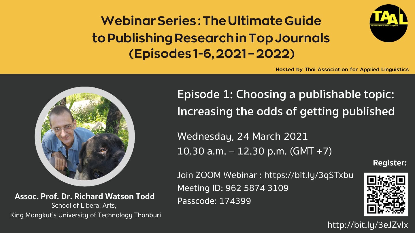 2. Also next Wednesday, 24th March, at 03:30 UK time – I’ve asked if there’ll be a recording! – the first in a series of six Thai Association of Applied Linguistics (TAAL) events which together make up ‘The Ultimate Guide to Publishing Research in Top Journals’ – Richard Watson Todd (plus one of his two amazingly large dogs in the photo attached below) on Choosing a Publishable Topic. Zoom link here https://bit.ly/3qSTxbu and more info in the photo attachment below.