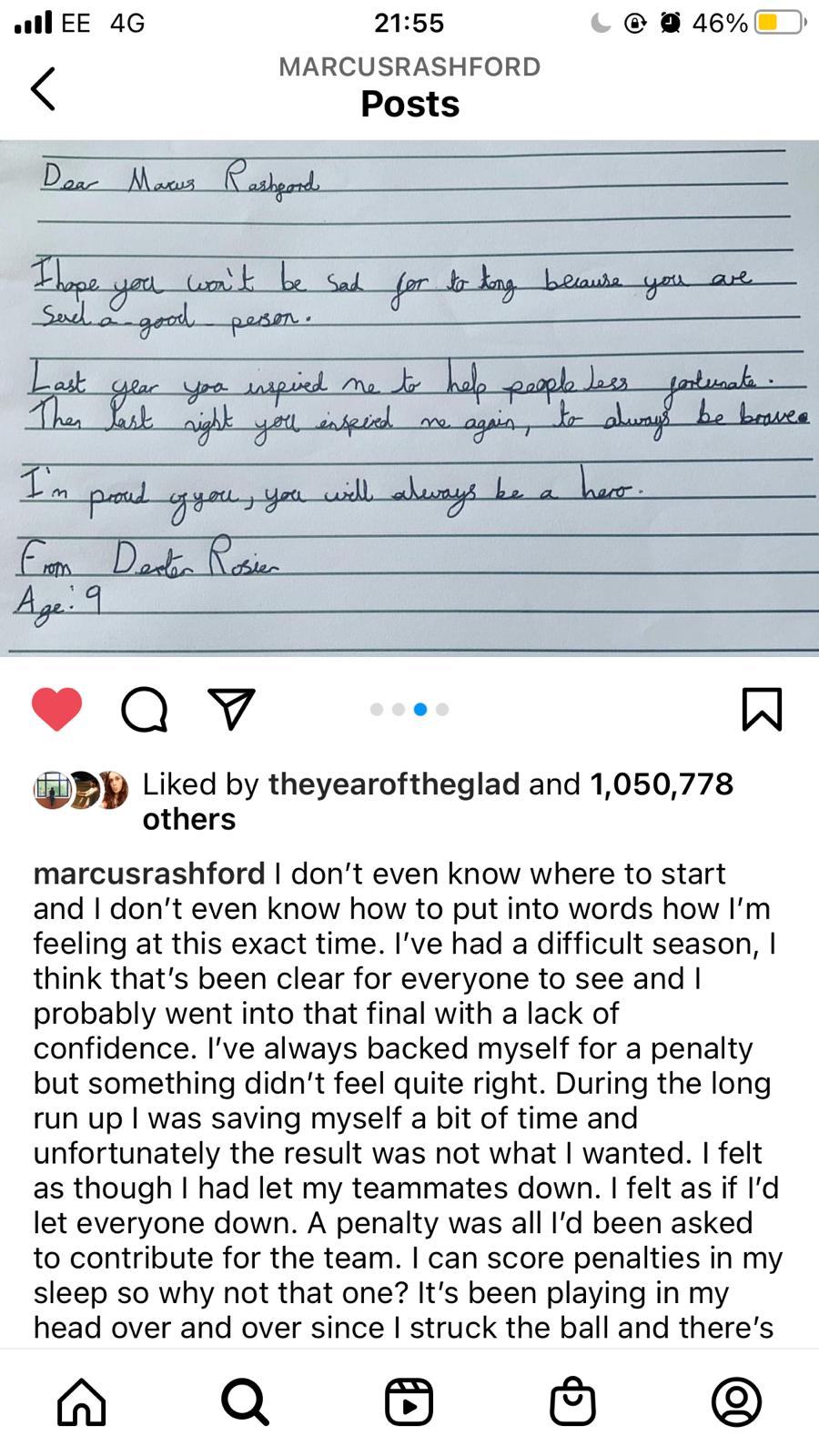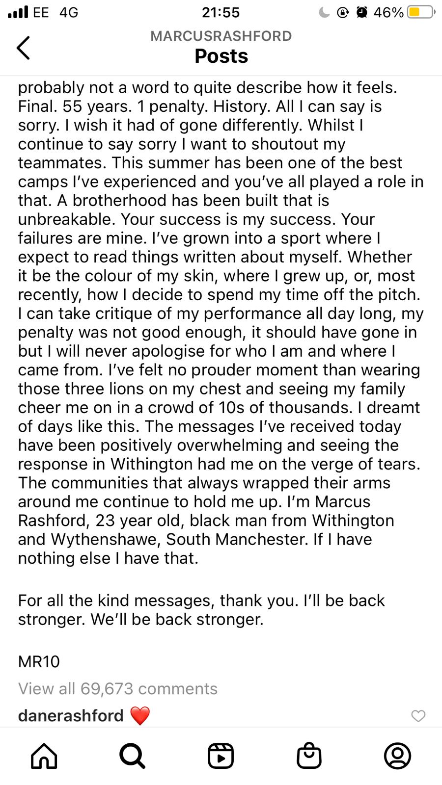 3. Marcus Rashford was one of the England players who missed a penalty at the end of the Euro 2020 final and has since been shamefully, disgracefully, appallingly, deeply depressingly vilified by racist England ‘supporters’. I’ve attached copies of his Twitter response below.